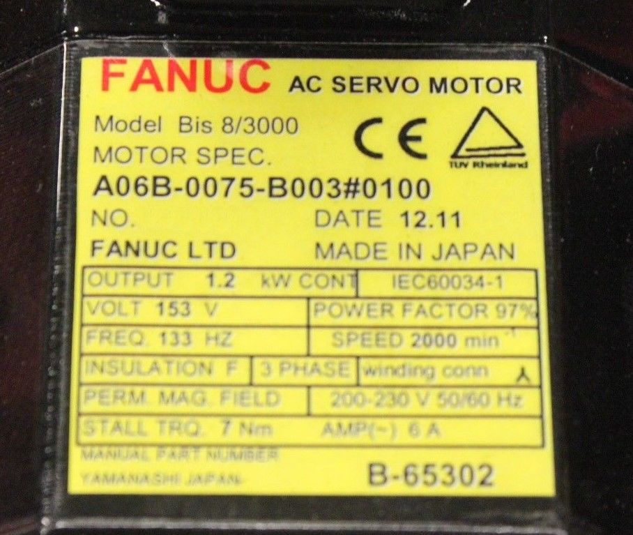 Products / Fanuc / Servo Motors / AC Servo / Fanuc A06B-0075-B003#0100 AC MOTOR BIS8/3000 B128IA IP67 *1 YEAR WARRANTY*