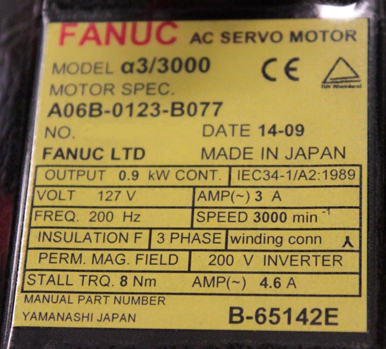 General Servo offers fully refurbished A06B-0123-B077 motors. This motor was re-built from OEM parts and test ran on Fanuc drives and controllers. The A06B-0123-B077 is ready to simply install into previous motor slot with no modifications.