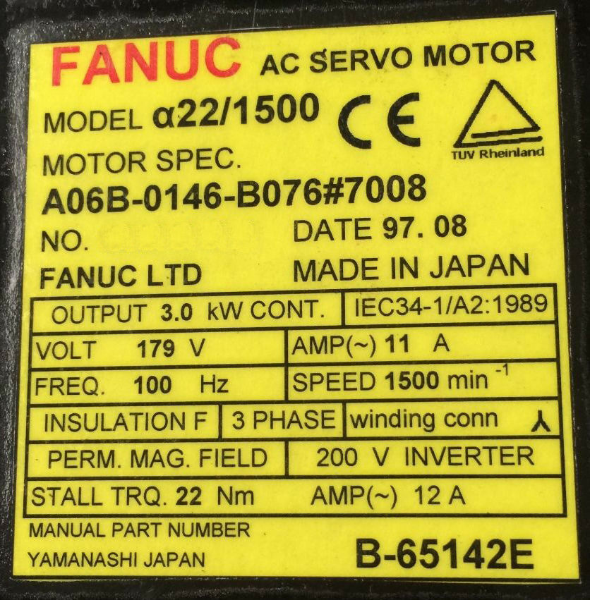 A06B-0146-B076#7008 Fanuc AC Servo Motor A22/1500, 179V, 100Hz, 3PH, 11A