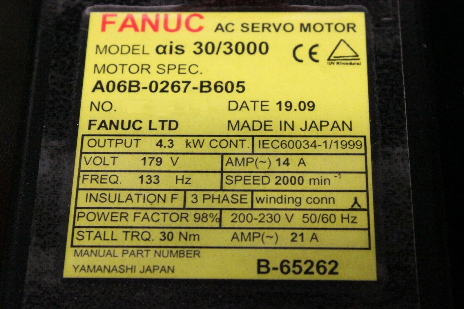 General Servo offers fully refurbished A06B-0267-B605 motors. This motor was re-built from OEM parts and test ran on Fanuc drives and controllers. The A06B-0267-B605 is equipped with a brake and arrives ready to simply install into previously motor slot with no modifications.