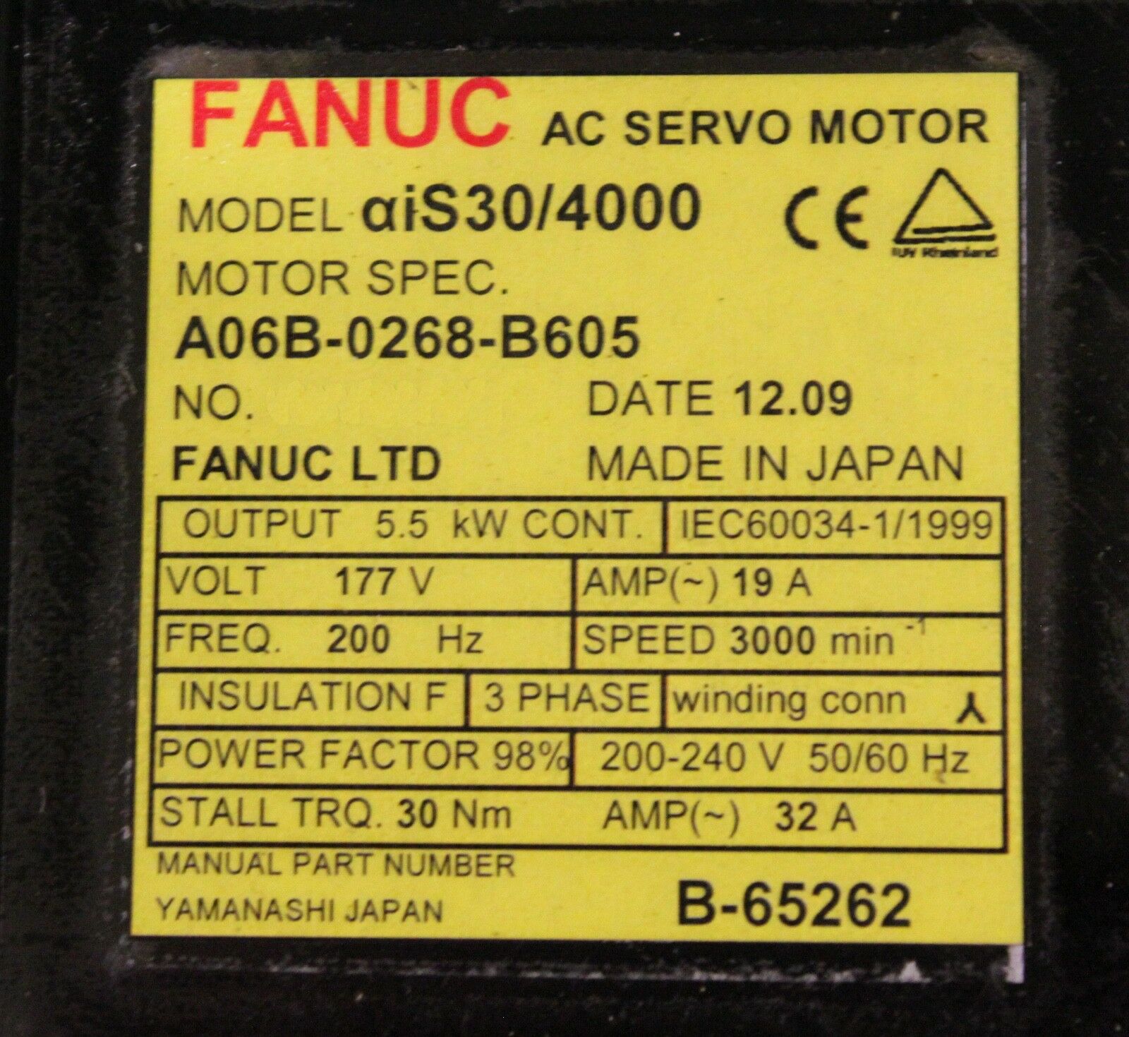 Products / Fanuc / Servo Motors / AC Servo / Fanuc A06B-0268-B605 AC MOTOR AIS30/4000 AA64I BRAKE *1 YEAR WARRANTY*