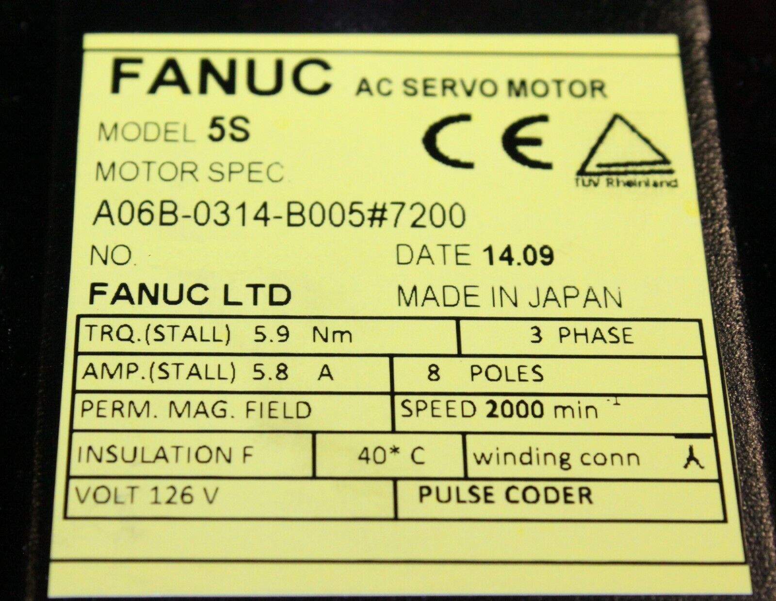 Products / Fanuc / Servo Motors / AC Servo / Fanuc A06B-0314-B005#7200 AC MOTOR 5S 2500P *1 YEAR WARRANTY*