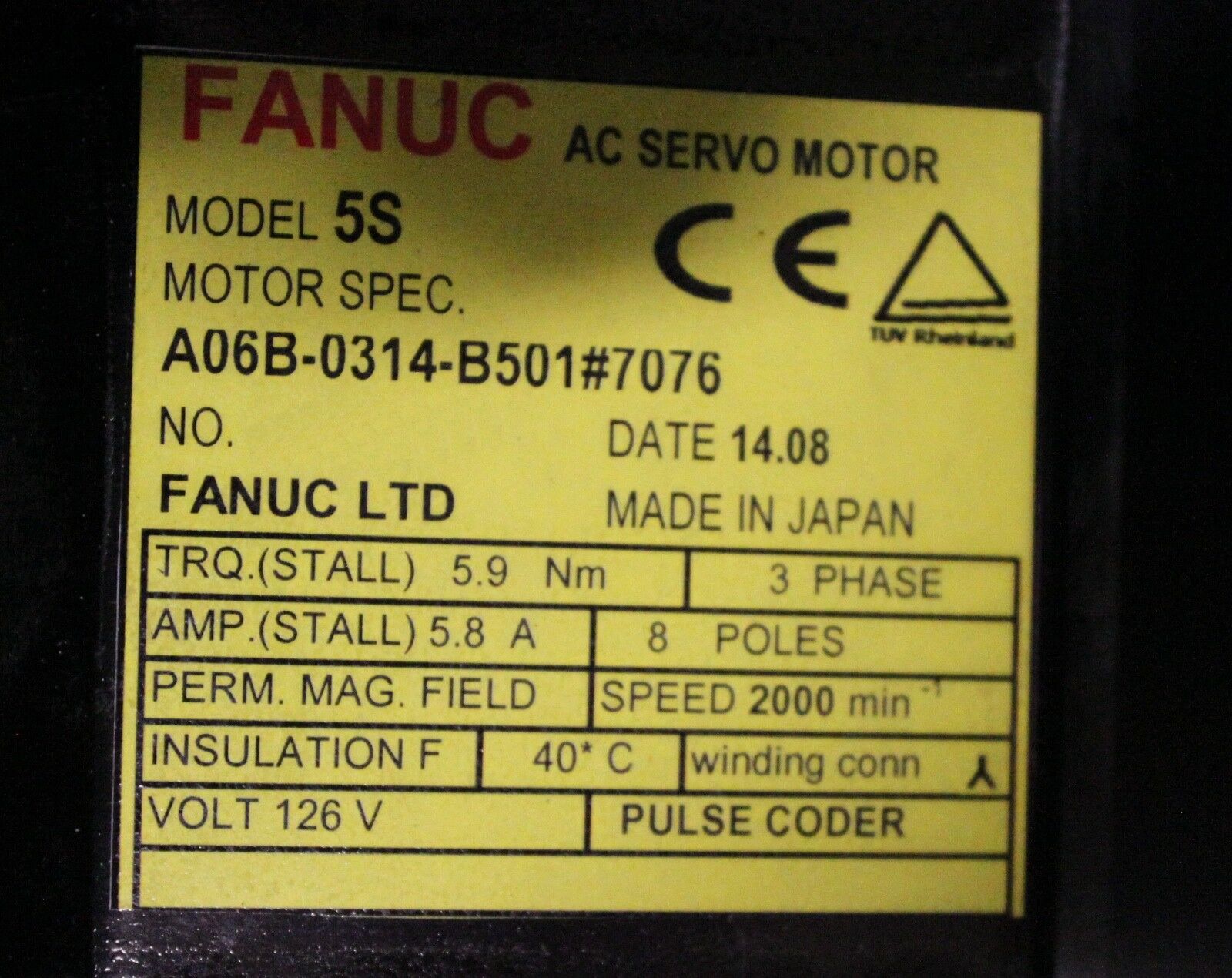 Products / Fanuc / Servo Motors / AC Servo / Fanuc A06B-0314-B501#7076 AC MOTOR 5S 2000P W/KEYWAY *1 YEAR WARRANTY*