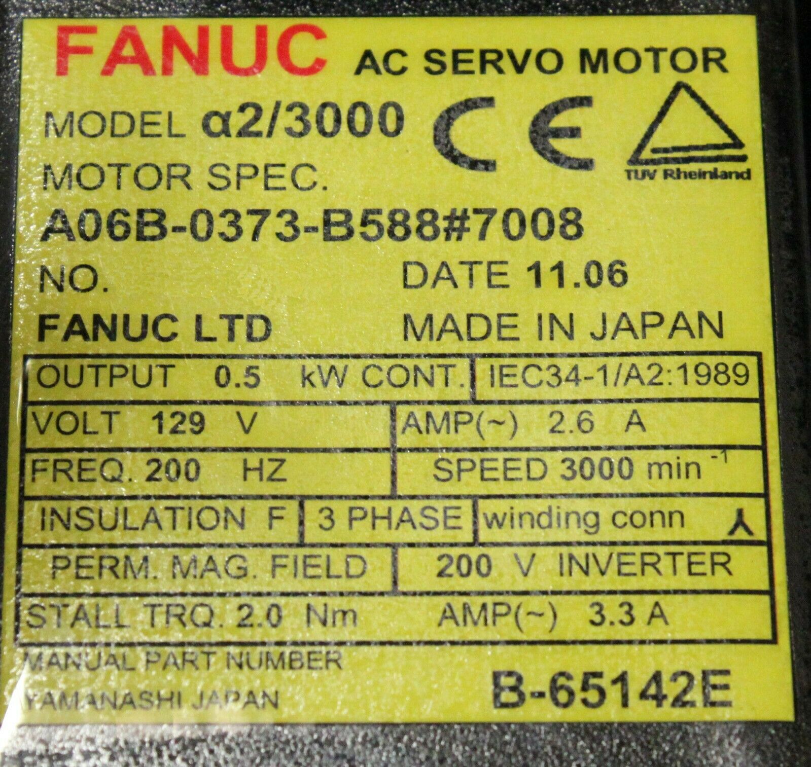 Products / Fanuc / Servo Motors / AC Servo / Fanuc A06B-0373-B588#7008 AC MOTOR A2/3000 A1000 KEYWAY *1 YEAR WARRANTY*