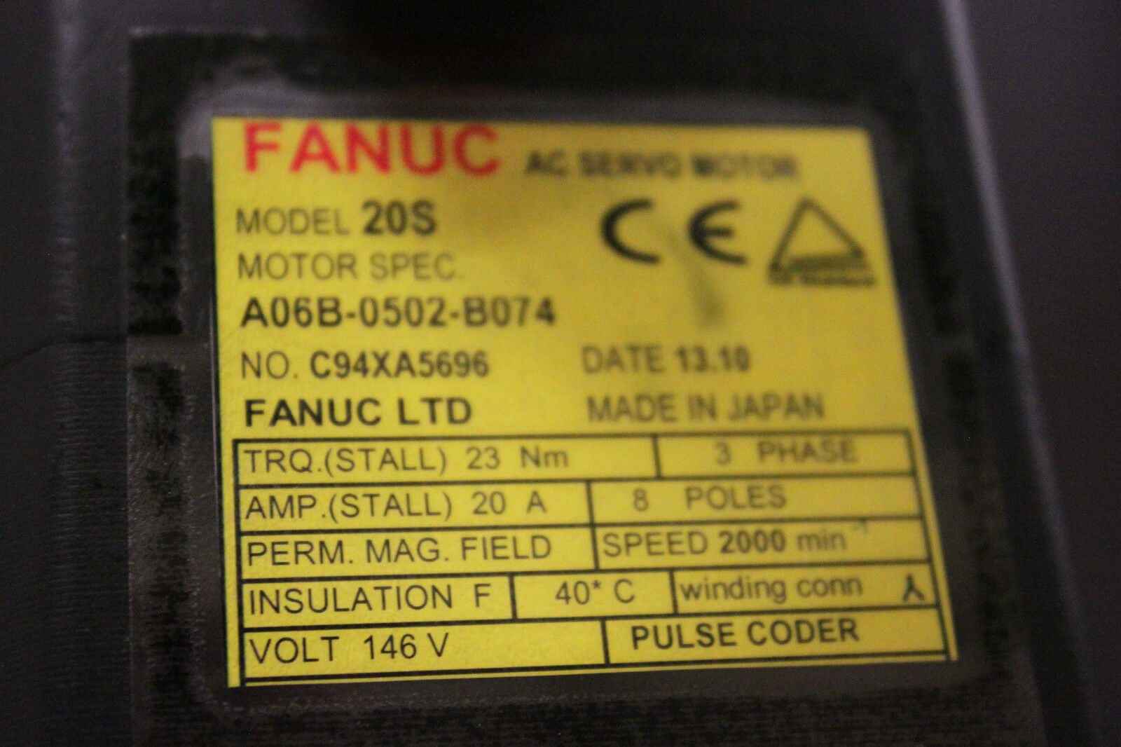 Products / Fanuc / Servo Motors / AC Servo / Fanuc A06B-0502-B074 AC MOTOR 20S SERIAL C *1 YEAR WARRANTY*