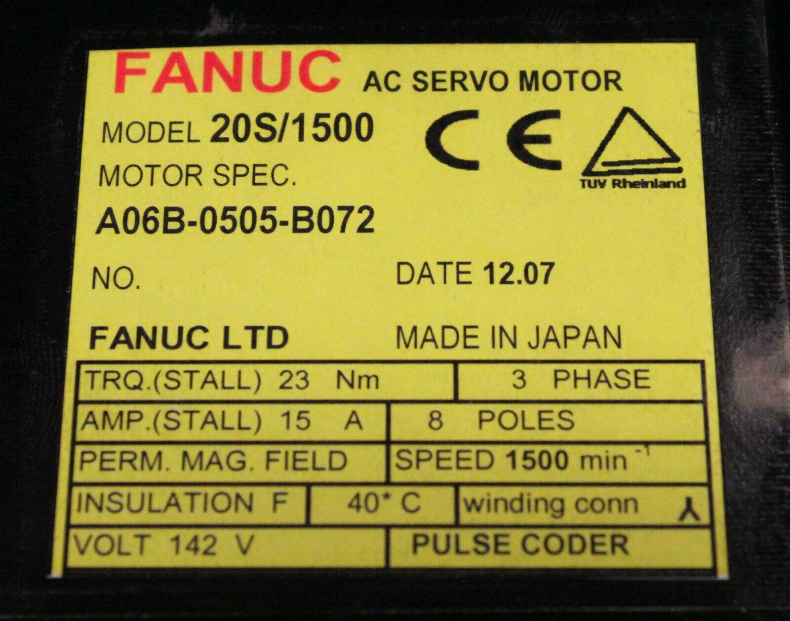 Products / Fanuc / Servo Motors / AC Servo / Fanuc A06B-0505-B072 AC MOTOR 20S/1500 SERIAL A *1 YEAR WARRANTY*