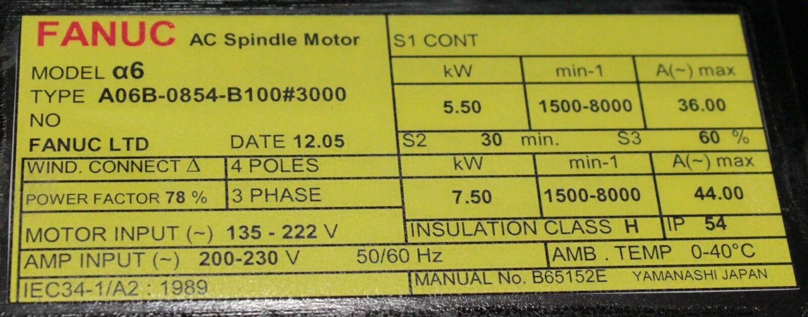 Products / Fanuc / Spindle Motors / A06B-0854-B100#3000 Fanuc AC Spindle Motor A6 , 135-222V, 50/60HZ, 3PH, 36A
